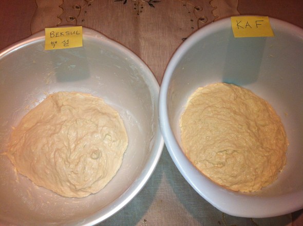 King Arthur and Beksul: dough comparison. Notice that the KAF dough has a slight yellowish tint (as did the flour, which can be seen in the previous post). This may be due to KAF having a slightly higher beta carotene content, due to either the type of wheat or the method of processing.