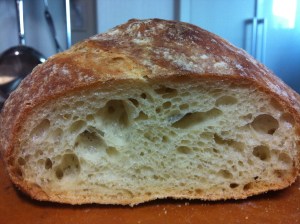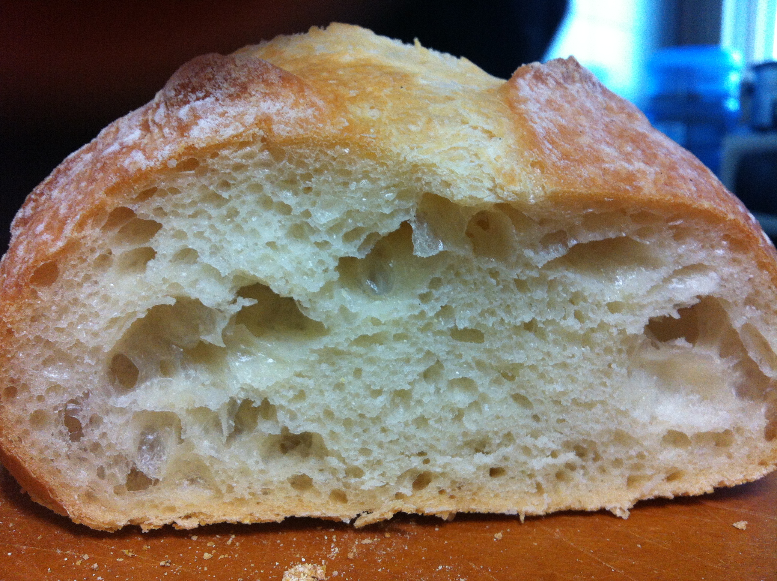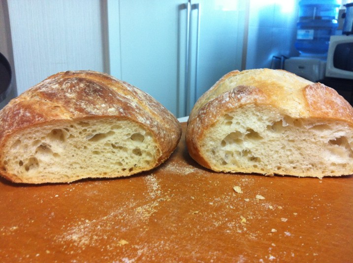 Once cooled, I sliced the loaves to reveal the crumb structure. Both had nice, big, uneven, shiny holes, the custard crumb that I was looking for. The Beksul had slightly larger holes overall and throughout the loaf.
