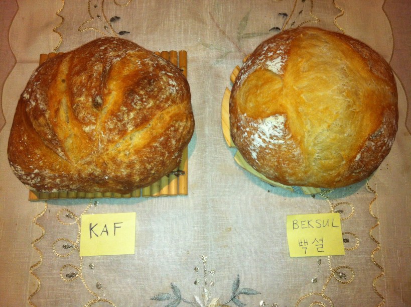 I then conducted a BLIND taste test with 9 individuals (2 Koreans, 2 French, 1 Nicaraguan, 2 Americans, 1 Japanese, and 1 Jamaican). I asked them to taste each bread carefully, and choose which loaf they preferred and why. KAF was labeled as “A” and Beksul as “B.”