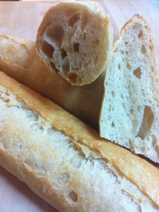 After cooling for about an hour, I sliced into one. Crust was still crisp, though could have been browner. The loaves may have dried out a wee bit too much during final proofing. The crumb structure was nice, big, and uneven (always funny to think that the words “big and uneven” are mutually desirable when it comes to lean bread). Crumb appearance was pretty, had shiny holes, with little flecks of whole wheat for nice color and aroma. Crumb texture was moister than what you usually get in France. Flavor was good. I may increase the whole wheat flour content of recipe on the next attempt and see what that does for flavor.